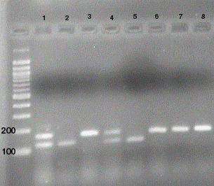 The Invasive Mussel Project takes advantage of a significant difference between the M. trossulus and M. galloprovincialis in a gene that codes for a foot protein (adhesive protein) used for making the byssal threads, which mussels use to attach themselves to a substrate. In M. galloprovincialis, there is a deletion in the adhesive protein gene, resulting in a shorter fragment when amplified with primers spanning the region. When using the primers Me15 and Me16, M. trossulus yields a fragment that is 168 bp long, whereas M. galloprovincialis will produce one that is only 126 nucleotides long. This difference is clearly distinguishable on a 2.5% agarose gel. Also, hybrids show up easily with both of the above bands present (see photo below):